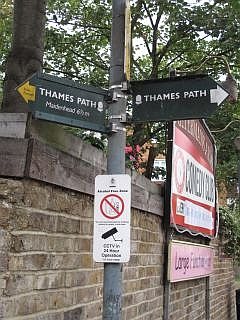 Het Thames Path is in Londen met borden duidelijk aangegeven. Het pad volgt bijna de hele route door de stad de rivier.